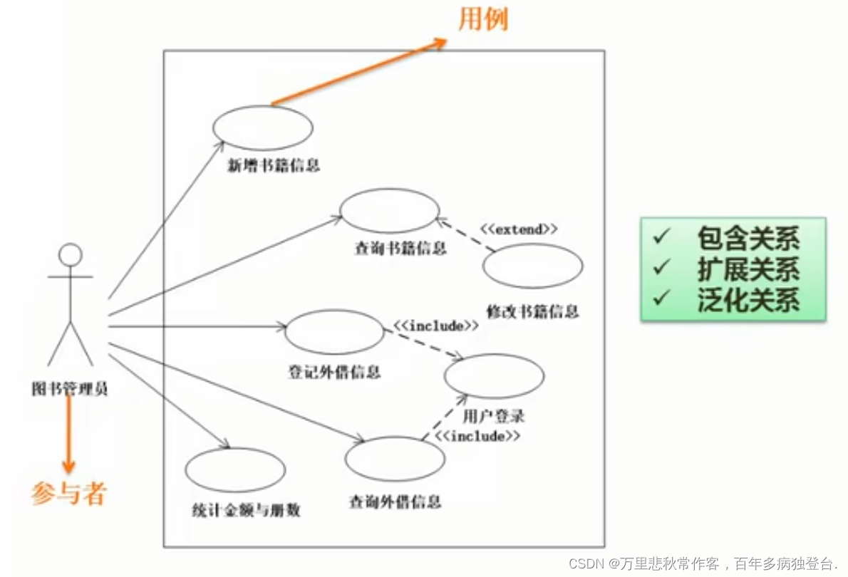 - 泛化关系:是对于类来说的。泛化是继承关系的一种,子类继承父类的所有行为和属性,子类可以新增新的功能或者重写父类功能。