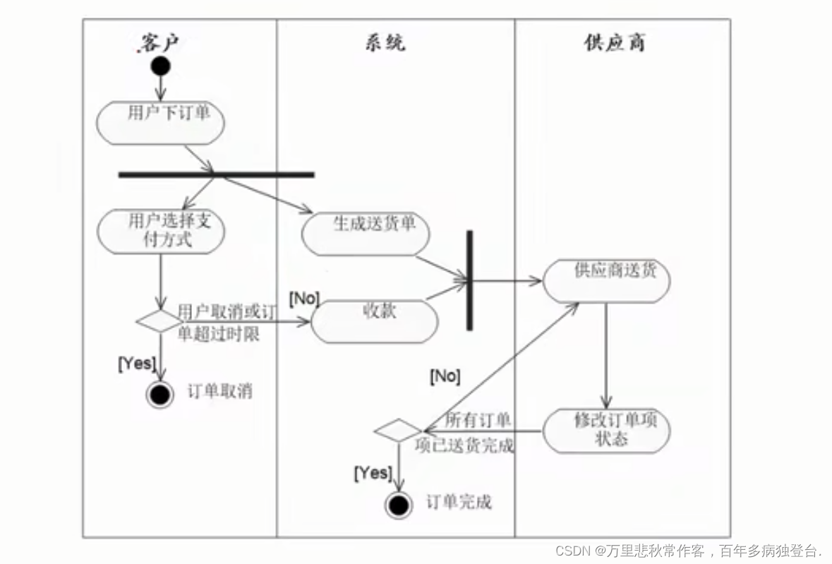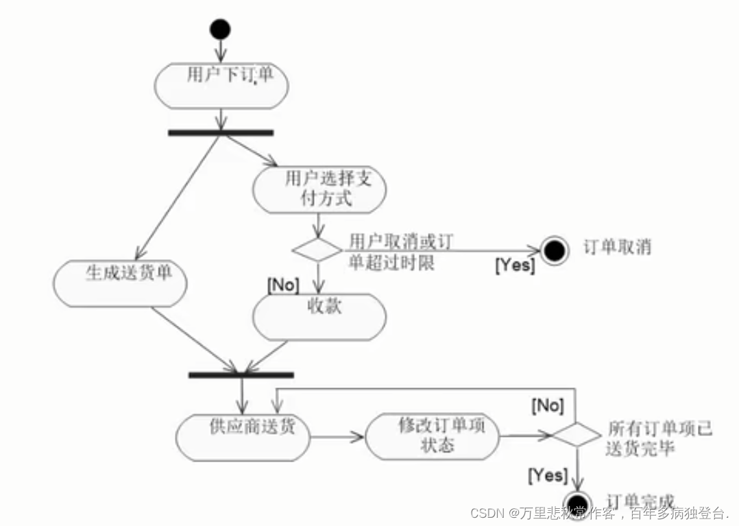 - 活动图:表现整个流程的处理情况分支状况。