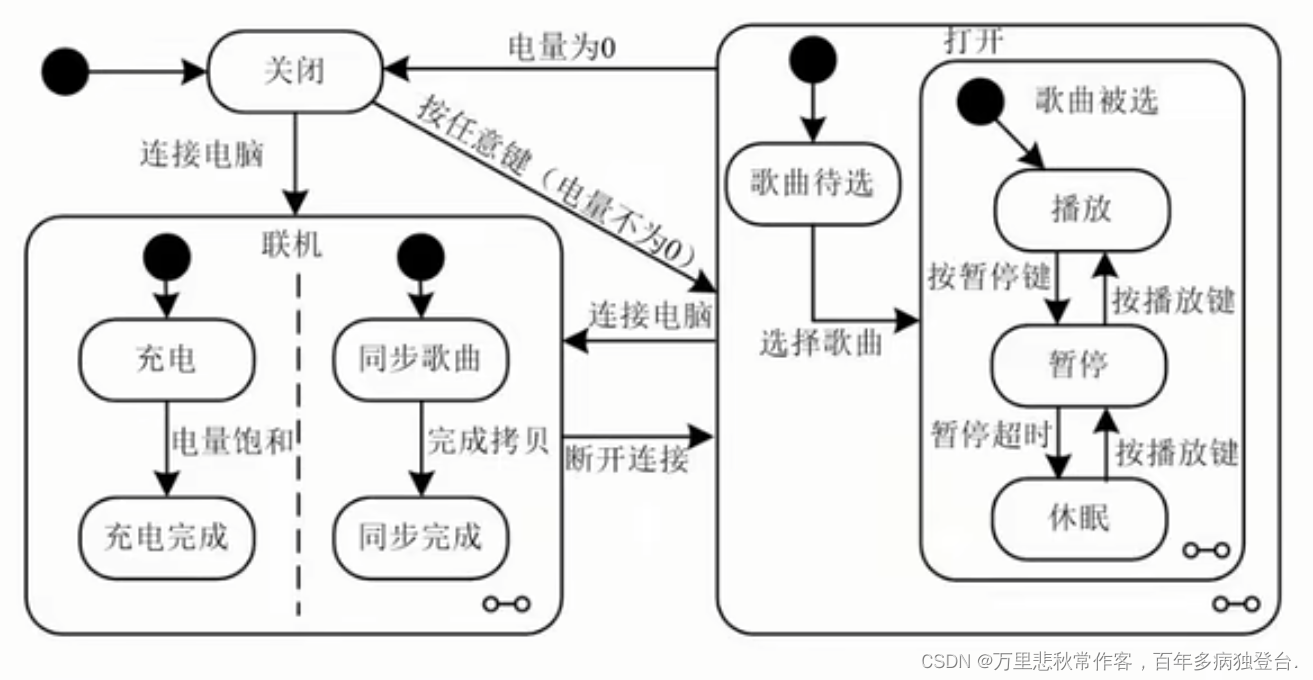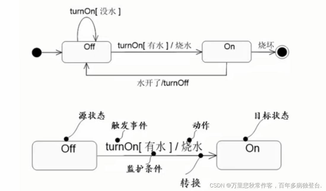 - 状态图:也是动态图:描述的是状态的变迁,以状态为节点; 箭线:代表的是事件。