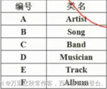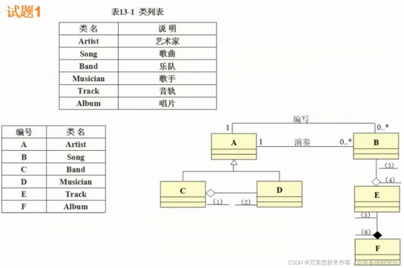 1)A:艺术家,B:歌曲,C:乐队,D:歌手,E:音轨,F:唱片(填写时填写类名)