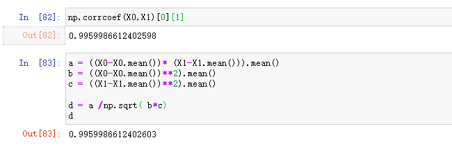 最后求整体: (X0 -X0.mean()) * (X1-X1.mean()).mean() /np.sqrt( ((X0-X0.mean)**2).mean()* ((X1-X1.mean)**2).mean())