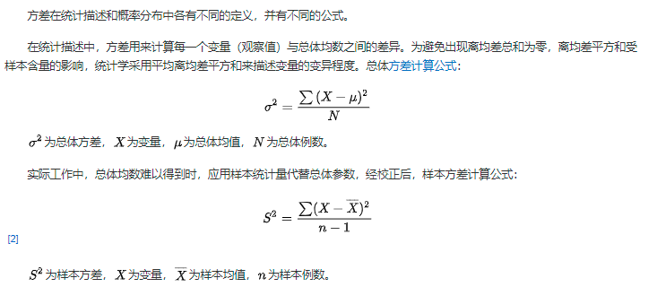 方差是在概率论和统计方差衡量随机变量或一组数据时离散程度的度量。概率论中方差用来度量随机变量和其数学期望(即均值)之间的偏离程度。统计中的方差(样本方差)是每个样本值与全体样本值的平均数之差的平方值的平均数。在许多实际问题中,研究方差即偏离程度有着重要意义。【百度百科】