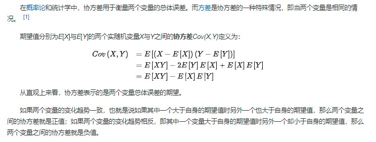 协方差表示的是两个变量的总体的误差,这与只表示一个变量误差的方差不同。如果两个变量的变化趋势一致,也就是说如果其中一个大于自身的期望值,另外一个也大于自身的期望值,那么两个变量之间的协方差就是正值。如果两个变量的变化趋势相反,即其中一个大于自身的期望值,另外一个却小于自身的期望值,那么两个变量之间的协方差就是负值。【百度百科】