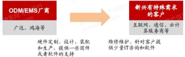 新興的客戶包括互聯網、通信、雲計算服務商等,並不需要傳統服務器廠商開發相應的軟件,或者需要品牌服務器廠商在其中參與開發設計的服務器底層架構和軟件部分减少了。雲計算開放聯盟通過制定服務器的標准,統一了對服務器需求的定制化方案。雲計算廠商只需要將這一定制化方案交給代工廠來直接進行采購和生產即可。