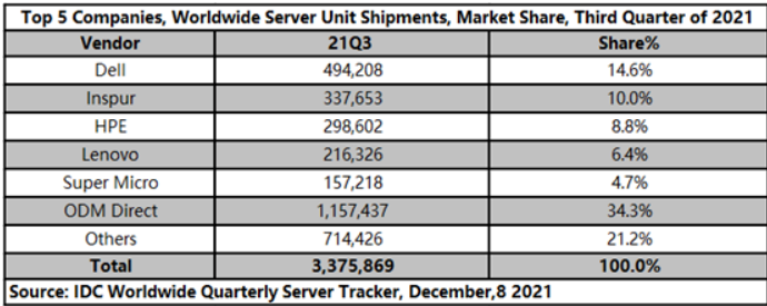 數據顯示2021Q3全球服務器市場季度報告,數據顯示,全球服務器市場同比上昇8.8%至246.8億美元,出貨量同比增長9.6%,達337.6萬臺。從廠商排名看,戴爾、浪潮、HPE保持全球前三,其中浪潮服務器的全球優勢進一步擴大,銷售額、出貨量增長達到15.0%、14.0%,超過平均增速,全球份額突破10%,繼續保持全球第二、中國第一。