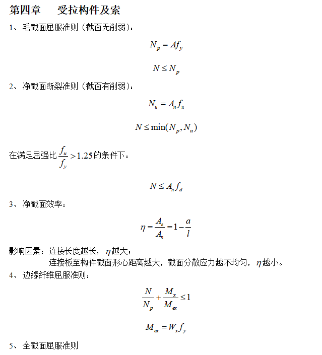 Principes fondamentaux de la structure en acier Chapitre I Introduction 1、 Avantages de la structure en acier: (1) Haute intensité、Poids léger; (2) Bonne qualité matérielle,Haute fiabilité; (3) Degré élevé d'industrialisation,Courte durée; (4) Bonne étanchéité; (5) Bonne performance sismique; (6) Bonne résistance à la chaleur; 2、 Défauts de la structure en acier: (1) Les prix de l'acier sont relativement élevés; (2) Faible résistance à la corrosion; (3) Faible résistance au feu; Chapitre II Matériaux de construction en acier 1、 Prescriptions applicables aux structures en acier: (1) Forte intensité; (2) Bonne plasticité; (3) Bonne résistance à l'impact; (4) Bonne performance de travail à froid; (5) Bonne soudabilité; (6) Bonne durabilité; 2、 Le point d'élasticité et l'amplitude du débit sont deux indices importants des propriétés mécaniques de l'acier.,Le premier est l'indice de résistance de l'acier,Ce dernier indique l'indice de déformation plastique de l'acier. 3、 Propriétés de fonctionnement de l'acier: (1) Au moment de la conception, le point d'élasticité doit être considéré comme la contrainte maximale réalisable pour l'acier.; (2) L'acier est conforme à la Constitution élastoplastique idéale; (3) Déformation plastique importante de l'acier avant défaillance,Presque équivalent à la déformation élastique200X; (4) Le rapport d'élasticité - résistance peut être considéré comme un coefficient pour mesurer la réserve de résistance de l'acier.,Plus le rapport d'élasticité est faible, plus la réserve de sécurité de l'acier est grande.. 4、 L'allongement ne représente pas la déformation plastique maximale de l'acier,Mais il est facile de produire une grande erreur lors de la mesure du retrait de la section transversale. 5、 L'indice de plasticité de l'acier est plus important que l'indice de résistance,La plasticité ajuste le défaut initial. 6、 Vieillissement:Sous des charges répétées intermittentes, Augmentation du point d'élasticité de l'acier , Réduction de la ténacité , Et la résistance ultime augmente légèrement . 7、 Fatigue: Après des charges répétées , Diminution de la résistance de l'acier . 8、 Quatrième théorie de la résistance (Contrainte convertie):