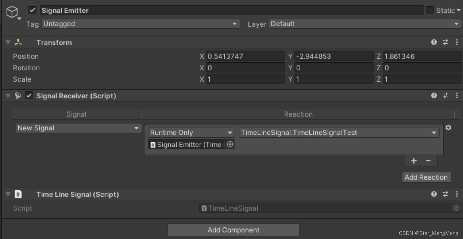Après cela, vous mettez Signal Emitter Faites glisser vers le nouveau Signal Track- Oui.,Encore.AssetsSous la table des matièresSignal Glisser sur le cadre correspondant . Lors de l'exécution au cadre courant , Il déclenche la fonction de rappel à l'intérieur .